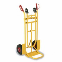 Rudl s více možnostmi použití - vozík nebo klasický rudl. Pevná i sklopná lopata, ochrana kol. Rukojeti jsou opatřeny plastovými madly s bezpečnostní ochranou zamezující poranění rukou. Plná polyuretanová kola rudlu jsou odolná propíchnutí. Otočná plná kolečka v poloze vozíku o průměru 100 mm. Povrchová úprava práškovým lakem ve žluté barvě RAL 1004.Víceúčelový rudl, do 250 kg, 2 nastavitelné polohy