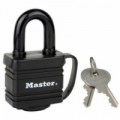 Visací zámek z vrstvené oceli s potahem z termoplastu. Odolný vůči povětrnostním vlivům a poškození. Šířka zámku 40 mm. Třmen z kalené oceli o průměru 9 mm odolný proti přeřezání, vložka se 4 stavítky. Dvojitá západka odolná proti vypáčení, krytka klíčové dírky. Bezpečnostní třída Master Lock™ 5.Visací zámek Master Lock odolný povětrnostním vlivům, průměr třemene 9 mm, výška 16 mm