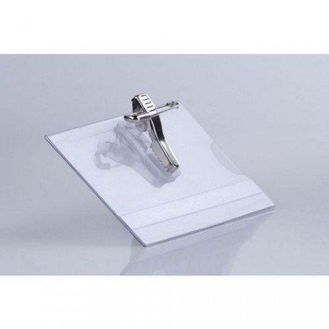 Tuhá, čirá visačka z PVC o rozměru 60×90 mm, s pojistným špendlíkem a svorkou „krokodýl“. Uvnitř s papírem 58×88 mm. Tloušťka PVC 0,3 mm zajišťuje tvarovou stálost.Visačky CT 123