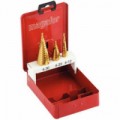 Cínový povlak pro dlouhou životnost a zabránění ulpívání třísek. Odvádění třísek spirálovitými drážkami. Stupňovité vrtáky snadno pronikají do materiálu. Vrtání a odstraňování otřepů na obou stranách plechu v jednom úkonu.Sada stupňovitých vrtáků Multi-Dia Magafor, 3 ks