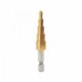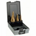Povlak TIN pro větší odolnost a zabránění ulpívání třísek. Třísky odváděné šroubovitými drážkami. Stupňovitý vrták, který snadno proniká do materiálu. Vrtání a odstraňování otřepů na obou stranách plechu v jednom úkonu.Stupňovité vrtáky