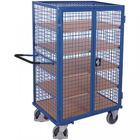 Klecové vozíky s mřížovými bočnicemi a stropem, rozměr oka 50 x 50 mm. Dvoukřídlé dveře s dvoubodovým rozvorovým zámkem na klíč. Ložná plocha a police z MDF desky, police lze variabilně vkládat v krocích po 50 mm. Sklopné tažné madlo. 2 pevná a 2 otočná kola s brzdou EasySTOP. Šedá kola z termoplastické pryže nezanechávající stopy na plastovém ráfku s přesnými kuličkovými ložisky.Vysoké klecové vozíky s křídlovými dveřmi, 5 polic, do 500 kg