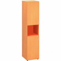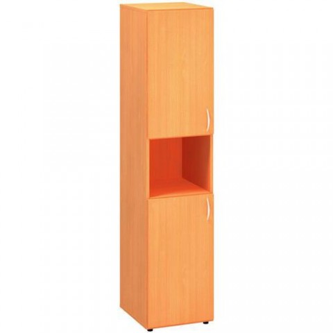 Vysoké kancelářské skříňky se dvěma dvířky a nikou ve čtyřech barevných provedeních. Vrchní a spodní části skříní jsou odděleny nikou. Korpusy jsou vyrobeny z laminované dřevotřísky tloušťky 18 mm s ABS hranou 1 mm. Záda skříní tvoří laminovaná dřevotříska o tloušťce 8 mm. Dřevěné police jsou upevněny kovovými trny, které zamezují jejich nežádoucímu vysunutí. Kancelářské skříně jsou vysoce odolné proti mechanickému poškození a disponují zvýšenou odolností vůči nadměrné vlhkosti. Pomocí aretačních šroubů umístěných ve dně korpusu lze vyrovnat nerovnosti podlahy a zajistit tak vyšší stabilitu skříňky. Skříně splňují normy ISO 9001, ISO 14001, ČSN 18001, Ekologicky šetrný výrobek.Vysoké úzké skříně Alfa 500, 178 x 40 x 47 cm, s nikou a dvířky - levé provedení