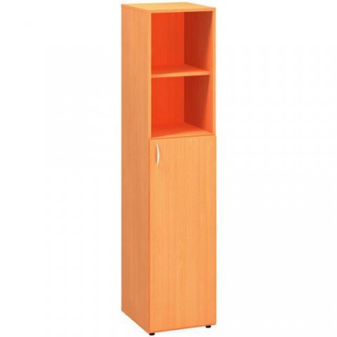 Vysoké kancelářské skříňky s nikou a dvířky ve čtyřech barevných provedeních. Korpusy jsou vyrobeny z laminované dřevotřísky tloušťky 18 mm s ABS hranou 1 mm. Záda skříní tvoří laminovaná dřevotříska o tloušťce 8 mm. Dřevěné police jsou upevněny kovovými trny, které zamezují jejich nežádoucímu vysunutí. Kancelářské skříně jsou vysoce odolné proti mechanickému poškození a disponují zvýšenou odolností vůči nadměrné vlhkosti. Pomocí aretačních šroubů umístěných ve dně korpusu lze vyrovnat nerovnosti podlahy a zajistit tak vyšší stabilitu skříňky. Skříně splňují normy ISO 9001, ISO 14001, ČSN 18001, Ekologicky šetrný výrobek.Vysoké úzké skříně Alfa 500, 178 x 40 x 47 cm, s nikou a dvířky - pravé provedení
