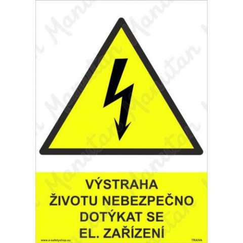 Tabulky, značky a samolepky "Výstraha životu nebezpečno dotýkat se el. zařízení" jsou tištěny na vysoce kvalitním materiálu, barvami s vysokou odolností proti otěru a UV záření. Provedení je plně v souladu s požadavky právních a technických předpisů, zejména Nařízení vlády č. 375/2017 Sb., ČSN ISO 3864-1, ČSN ISO 3864-2, ČSN ISO 3864-3, ČSN ISO 3864-4. Bezpečnostní výstražná tabulka v provedení plast nebo samolepka k označní el. vedení pod napětím. Tabulka předchází úrazům dotykem živých částí drátů vedení.Výstražné tabulky - Výstraha životu nebezpečno dotýkat se el. zařízení