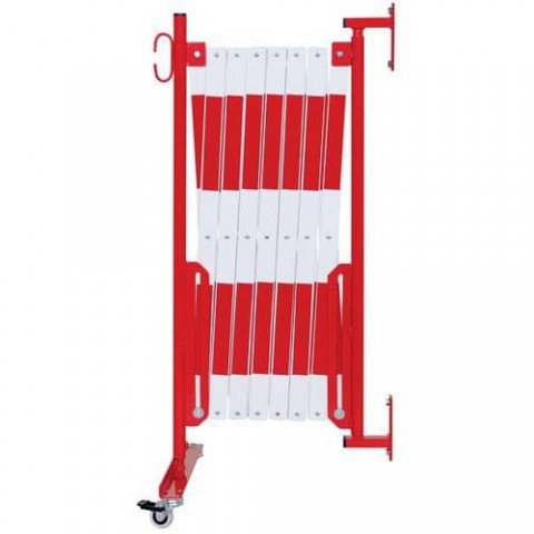Výsuvné ocelové zábrany na kolečkách a montáž na zeď pro dočasné oplocení. Dvoubarevné pruhy pro lepší viditelnost. Vhodné pouze pro vnitřní použití. Snadná manipulace, skladování a používání díky kolečkům s brzdou.Výsuvné kovové zábrany na kolečkách Dancop, montáž na stěnu