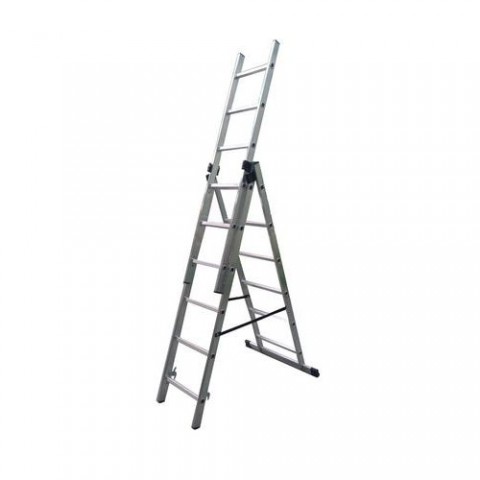 Víceúčelové žebříky vyrobené z odolných hliníkových lisovaných profilů vhodné pro práci ve výškách. Lze použít jako štafle, výsuvný nebo opěrný žebřík. Drážky na povrchu příček a protiskluzové patky pro větší bezpečnost. Bezpečnostní háčky zabraňují náhodnému rozložení žebříku. Certifikováno dle TUV a EN 131.Výsuvný hliníkový žebřík Basic, 3 x 6 příček