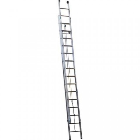 Dvoudílný výsuvný žebřík po 15 příčkách, vhodný pro profesionální použití ve výškách. Žebřík je opatřen lanem, díky kterému je možné žebřík vysouvat a spouštět na požadovanou výšku. Oba díly lze použít samostatně, horní díl žebříku je navíc vybaven pojezdovými kolečky. Vyšší bezpečnost zajišťují plastové protiskluzové patky. Splňuje normu ČSN EN 131 a je opatřen TÜV certifikátem.Výsuvný hliníkový žebřík PROFI s lanem, 2 x 15 příček, Alpos Alu
