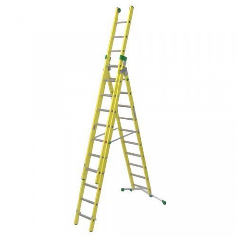 Sklolaminátový trojdílný žebřík vhodný do provozů s vyšším rizikem elektrických výbojů. Žebřík je certifikovaný, splňuje normu EN 131 a EN 61478 v kategorii I. - 30.000 Voltů. Lze sestavit jako stojací štafle nebo výsuvný a opěrný žebřík. Stabilizační teleskopická základna o šířce 83 až 128 cm, plastové protiskluzové patky. Dvě kolečka ve vrchní části žebříku pro snadnou manipulaci. Příčky o rozměru 30 x 30 mm mají vroubkovaný povrch a jsou v úklonu 68 ° pro pohodlný a bezpečný nášlap. Nosné profily žebříku o rozměru 26 x 94 mm. Šířka prvního dílu žebříku je 50 cm, šířka druhého dílu je 45 cm a třetího 39 cm.Výsuvný sklolaminátový žebřík Facal, 11 + 11 + 10 příček