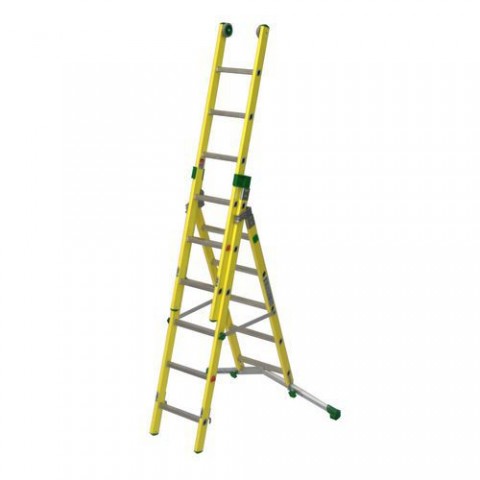 Sklolaminátový trojdílný žebřík vhodný do provozů s vyšším rizikem elektrických výbojů. Žebřík je certifikovaný, splňuje normu EN 131 a EN 61478 v kategorii I. - 30.000 Voltů. Lze sestavit jako stojací štafle nebo výsuvný a opěrný žebřík. Stabilizační teleskopická základna o šířce 83 až 128 cm, plastové protiskluzové patky. Dvě kolečka ve vrchní části žebříku pro snadnou manipulaci. Příčky o rozměru 30 x 30 mm mají vroubkovaný povrch a jsou v úklonu 68 ° pro pohodlný a bezpečný nášlap. Nosné profily žebříku o rozměru 26 x 68 mm. Šířka prvního dílu žebříku je 50 cm, šířka druhého dílu je 45 cm a třetího 39 cm.Výsuvný sklolaminátový žebřík Facal, 6 + 6 + 5 příček