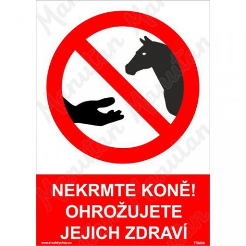 Tabulky, značky a samolepky "Nekrmte koně ohrožujete jejich zdraví" jsou tištěny na vysoce kvalitním materiálu, barvami s vysokou odolností proti otěru a UV záření. Provedení je plně v souladu s požadavky právních a technických předpisů, zejména Nařízení vlády č. 375/2017 Sb., ČSN ISO 3864-1, ČSN ISO 3864-2, ČSN ISO 3864-3, ČSN ISO 3864-4. Používá se k označení míst, kde je zákaz krmení koní.Zákazové tabulky - Nekrmte koně ohrožujete jejich zdraví