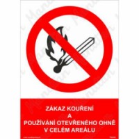 Bezpečnostní značka, tabulka nebo samolepka "Zákaz kouření a používání otevřeného ohně v celém areálu" je tištěna na vysoce kvalitním materiálu, barvami s vysokou odolností proti otěru a UV záření. Provedení plně odpovídá požadavkům právních a technických předpisů, zejména Nařízení vlády č. 375/2017 Sb., ČSN ISO 3864-1, ČSN ISO 3864-2, ČSN ISO 3864-3, ČSN ISO 3864-4. Používá se k označení míst a objektů, kde je zákaz kouření a manipulace s plamenem v celém areálu.Zákazové tabulky - Zákaz kouření a používání otevřeného ohně v celém areálu