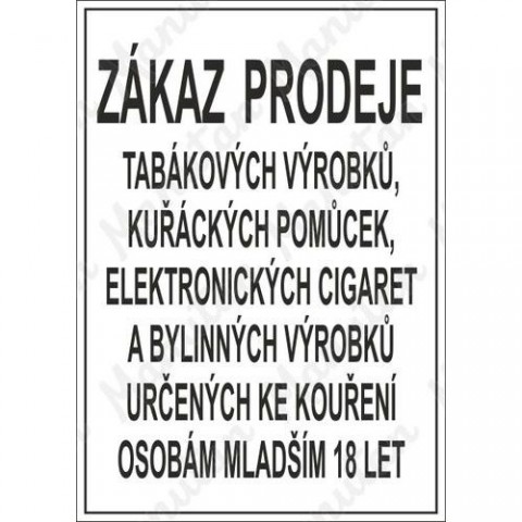 Značky, tabulky a samolepky "Zákaz prodeje alkoholických nápojů osobám mladším 18 let" jsou tištěny na velmi kvalitním materiálu, barvami s vysokou odolností proti otěru a UV záření. Zaručujeme splnění požadavků technických a právních předpisů, zejména Nařízení vlády č. 375/2017 Sb., ČSN ISO 3864-1, ČSN ISO 3864-2, ČSN ISO 3864-3, ČSN ISO 3864-4.Zákazové tabulky - Zákaz prodeje alkoholických nápojů osobám mladším 18 let