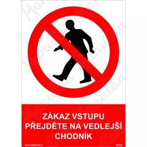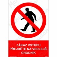 Bezpečnostní značení tabulkou, značkou nebo samolepkou "Zákaz vstupu přejděte na vedlejší chodník" je tištěno na vysoce kvalitním materiálu, barvami s vysokou odolností proti otěru a UV záření. Provedení je plně v souladu s požadavky právních a technických předpisů, zejména Nařízení vlády č. 375/2017 Sb., ČSN ISO 3864-1, ČSN ISO 3864-2, ČSN ISO 3864-3, ČSN ISO 3864-4. Používá se k označení chodníku, na který je z bezpečnostních důvodů vstup zakázán, zároveň přikazuje přejít na vedlejší chodník.Zákazové tabulky - Zákaz vstupu přejděte na vedlejší chodník