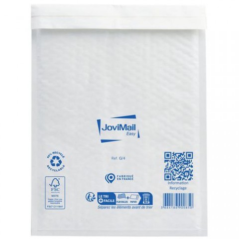 Bílá kraftová obálka Jovimail s bublinkovou fólií a nízkou hmotností. Ideální pro zasílání křehkých předmětů. Hladká fólie pro snadné vkládání dokumentů a dalších předmětů. Hladký papírový podklad pro snadný popis obálky. Obálka se samolepicí páskou pro uzavření.Zásilkové obálky z bublinkové fólie, 100 ks