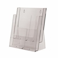 Plastový stojánek na letáky, brožury, propagační materiály apod. Dvě kapsy ve stupních za sebou orientované na výšku. Možnost rozdělení kapes děličem na kapsy formátu A6. Stojánek je standardně dodáván bez potisku.Zásobník na letáky JD8, 2 kapsy na výšku, A4