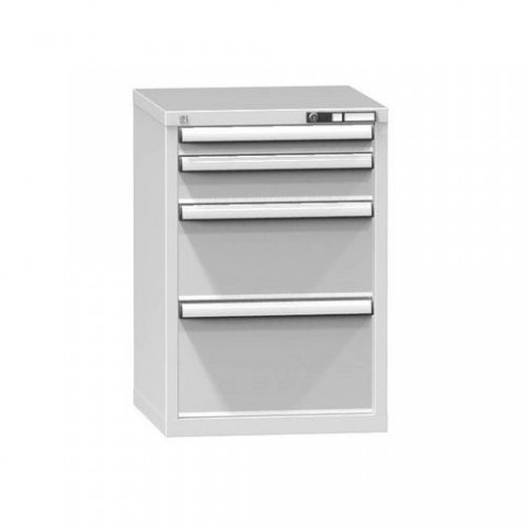 Zásuvková skříň je opatřená mechanismem centrálního zamykání a blokace zásuvek. Zásuvky jsou základním skladovacím prvkem, a proto splňují vysoké požadavky na pevnost a stabilitu. Korpusy zásuvkových skříní tvoří svařenec jednotlivých konstrukčních dílů z kvalitních ocelových plechů. Vnitřní konstrukce korpusů je opatřena perforací po 25 mm. Tuto perforaci využíváme k uchycení vodicích lišt zásuvek, jejich výškovému uspořádání a nakonfigurování požadované zásuvkové sestavy. Přestavování vodicích lišt nebo háčků polic probíhá jednoduše a velice rychle bez použití nástrojů.Zásuvkové skříně ZA4, 578 x 600 x 840 mm