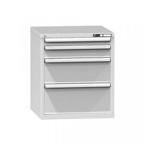 Zásuvková skříň je opatřená mechanismem centrálního zamykání a blokace zásuvek. Zásuvky jsou základním skladovacím prvkem, a proto splňují vysoké požadavky na pevnost a stabilitu. Korpusy zásuvkových skříní tvoří svařenec jednotlivých konstrukčních dílů z kvalitních ocelových plechů. Vnitřní konstrukce korpusů je opatřena perforací po 25 mm. Tuto perforaci využíváme k uchycení vodicích lišt zásuvek, jejich výškovému uspořádání a nakonfigurování požadované zásuvkové sestavy. Přestavování vodicích lišt nebo háčků polic probíhá jednoduše a velice rychle bez použití nástrojů.Zásuvkové skříně ZB4, 731 x 753 x 840 mm