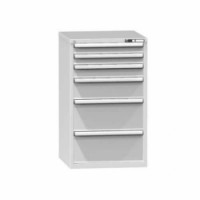Zásuvková skříň je opatřená mechanismem centrálního zamykání a blokace zásuvek. Zásuvky jsou základním skladovacím prvkem, a proto splňují vysoké požadavky na pevnost a stabilitu. Korpusy zásuvkových skříní tvoří svařenec jednotlivých konstrukčních dílů z kvalitních ocelových plechů. Vnitřní konstrukce korpusů je opatřena perforací po 25 mm. Tuto perforaci využíváme k uchycení vodicích lišt zásuvek, jejich výškovému uspořádání a nakonfigurování požadované zásuvkové sestavy. Přestavování vodicích lišt nebo háčků polic probíhá jednoduše a velice rychle bez použití nástrojů.Zásuvkové skříně ZB5, 731 x 753 x 1215 mm