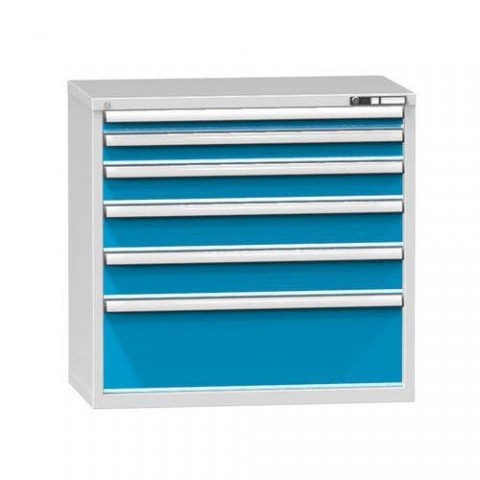 Zásuvková skříň je opatřená mechanismem centrálního zamykání a blokace zásuvek. Zásuvky jsou základním skladovacím prvkem, a proto splňují vysoké požadavky na pevnost a stabilitu. Korpusy zásuvkových skříní tvoří svařenec jednotlivých konstrukčních dílů z kvalitních ocelových plechů. Vnitřní konstrukce korpusů je opatřena perforací po 25 mm. Tuto perforaci využíváme k uchycení vodicích lišt zásuvek, jejich výškovému uspořádání a nakonfigurování požadované zásuvkové sestavy. Přestavování vodicích lišt nebo háčků polic probíhá jednoduše a velice rychle bez použití nástrojů.Zásuvkové skříně ZC4, 1037 x 600 x 990 mm