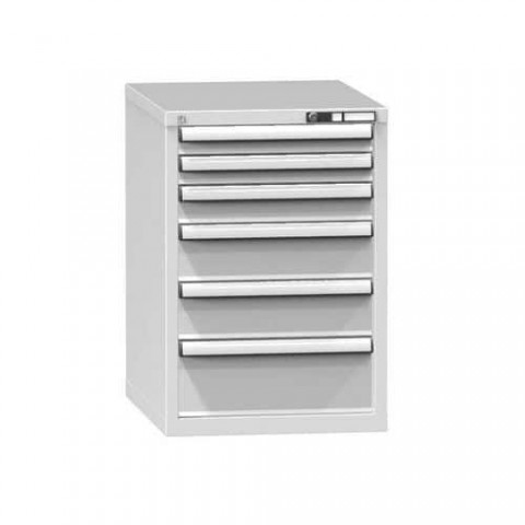 Zásuvková skříň je opatřená mechanismem centrálního zamykání a blokace zásuvek. Zásuvky jsou základním skladovacím prvkem, a proto splňují vysoké požadavky na pevnost a stabilitu. Korpusy zásuvkových skříní tvoří svařenec jednotlivých konstrukčních dílů z kvalitních ocelových plechů. Vnitřní konstrukce korpusů je opatřena perforací po 25 mm. Tuto perforaci využíváme k uchycení vodicích lišt zásuvek, jejich výškovému uspořádání a nakonfigurování požadované zásuvkové sestavy. Přestavování vodicích lišt nebo háčků polic probíhá jednoduše a velice rychle bez použití nástrojů.Zásuvkové skříně ZE6, 578 x 753 x 840 mm
