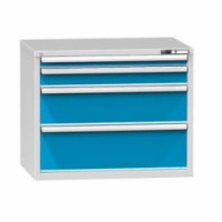 Zásuvková skříň je opatřená mechanismem centrálního zamykání a blokace zásuvek. Zásuvky jsou základním skladovacím prvkem, a proto splňují vysoké požadavky na pevnost a stabilitu. Korpusy zásuvkových skříní tvoří svařenec jednotlivých konstrukčních dílů z kvalitních ocelových plechů. Vnitřní konstrukce korpusů je opatřena perforací po 25 mm. Tuto perforaci využíváme k uchycení vodicích lišt zásuvek, jejich výškovému uspořádání a nakonfigurování požadované zásuvkové sestavy. Přestavování vodicích lišt nebo háčků polic probíhá jednoduše a velice rychle bez použití nástrojů.Zásuvkové skříně ZG2, 1037 x 753 x 840 mm