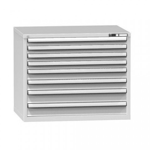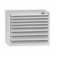 Zásuvková skříň je opatřená mechanismem centrálního zamykání a blokace zásuvek. Zásuvky jsou základním skladovacím prvkem, a proto splňují vysoké požadavky na pevnost a stabilitu. Korpusy zásuvkových skříní tvoří svařenec jednotlivých konstrukčních dílů z kvalitních ocelových plechů. Vnitřní konstrukce korpusů je opatřena perforací po 25 mm. Tuto perforaci využíváme k uchycení vodicích lišt zásuvek, jejich výškovému uspořádání a nakonfigurování požadované zásuvkové sestavy. Přestavování vodicích lišt nebo háčků polic probíhá jednoduše a velice rychle bez použití nástrojů.Zásuvkové skříně ZG6, 1037 x 753 x 840 mm