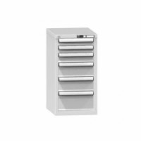 Zásuvková skříň je opatřená mechanismem centrálního zamykání a blokace zásuvek. Zásuvky jsou základním skladovacím prvkem, a proto splňují vysoké požadavky na pevnost a stabilitu. Korpusy zásuvkových skříní tvoří svařenec jednotlivých konstrukčních dílů z kvalitních ocelových plechů. Vnitřní konstrukce korpusů je opatřena perforací po 25 mm. Tuto perforaci využíváme k uchycení vodicích lišt zásuvek, jejich výškovému uspořádání a nakonfigurování požadované zásuvkové sestavy. Přestavování vodicích lišt nebo háčků polic probíhá jednoduše a velice rychle bez použití nástrojů.Zásuvkové skříně ZL7, 442 x 600 x 840 mm