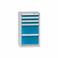 Zásuvková skříň je opatřená mechanismem centrálního zamykání a blokace zásuvek. Zásuvky jsou základním skladovacím prvkem, a proto splňují vysoké požadavky na pevnost a stabilitu. Korpusy zásuvkových skříní tvoří svařenec jednotlivých konstrukčních dílů z kvalitních ocelových plechů. Vnitřní konstrukce korpusů je opatřena perforací po 25 mm. Tuto perforaci využíváme k uchycení vodicích lišt zásuvek, jejich výškovému uspořádání a nakonfigurování požadované zásuvkové sestavy. Přestavování vodicích lišt nebo háčků polic probíhá jednoduše a velice rychle bez použití nástrojů.Zásuvkové skříně ZN3, 578 x 464 x 990 mm