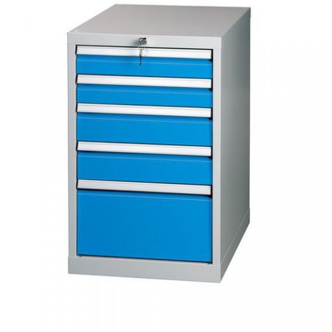 Zásuvkový kontejner s pěti zásuvkami má centrální uzamykání s blokací, která zamezuje vysunutí více zásuvek najednou. Součástí jsou popisové lišty na čelech zásuvek, které slouží pro lepší orientaci. Konstrukce skříňky má předvrtány otvory pro upevnění pracovní desky.Zásuvkový kontejner, 81 x 50 x 70 cm , 5 zásuvek