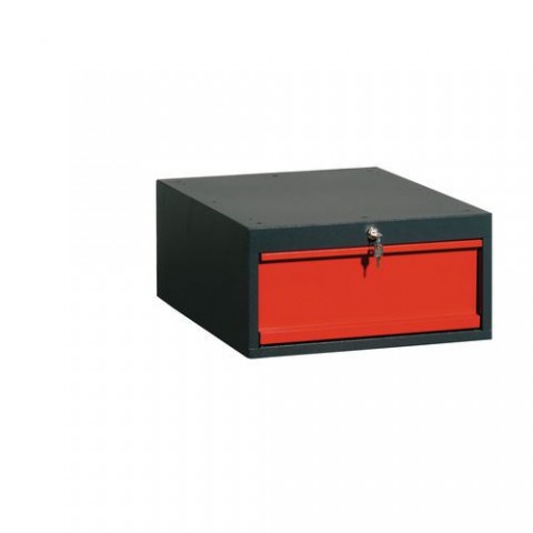 Svařovaná konstrukce kontejneru z celového plechu tl. 0,7 až 0,8 mm. 100% výsuv zásuvky, kuličková ložiska pojezdů, uzamykání cylindrickým zámkem se dvěma klíči. Povrchová úprava práškovou barvou.Závěsné kontejnery, 26 x 51 x 59 cm, 1 zásuvka