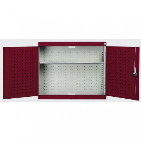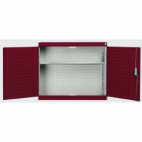 Závěsná kovová skříňka s perforovanou zadní stěnou a 1 policí. Zadní část skřínky a vnitřní část dveří jsou opatřeny perforovanými panely pro uchycení držáků nářadí (typ perfo). Pozinkovaná police výškově nastavitelná v rastru 25 mm. Robustní svařovaná ocelová konstrukce s nosností až do 1 tuny, povrchová úprava práškovým lakem. Zamykání cylindrickým zámkem se dvěma klíči. Plastové boxy a držáky nářadí nejsou součastí dodávky.Závěsné skříňky Bott Cubio s perfopanely, 1 police