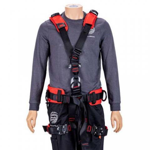 Pádový bezpečnostní postroj se dvěma kotevními body: vpředu a vzadu. S předními a zadními indikátory nárazu. Polstrování zad, ramen, boků a nohou. Dva automaticky resetovatelné držáky šňůrek.Závěsný postroj pro zachycení pádu 3M™ E200 Protecta®