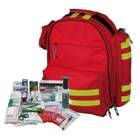 Zdravotnický batoh s reflexními pruhy pro poskytnutí první pomoci v terénu. Vhodný pro týmy záchranné služby, hasiče, lékaře pracující mimo ordinaci, sportovní kluby a školy. Batoh tvoří 4 venkovní kapsy na zip a 5 vnitřních barevných kapes s průhledným okénkem a uchycením na suchý zip. Batoh je vyroben z voděodolného polyesteru odolného proti opotřebení. Vyztužená záda, možnost nošení i v ruce pomocí úchytu v horní části batohu.Zdravotnický batoh první pomoci s náplní VÝROBA