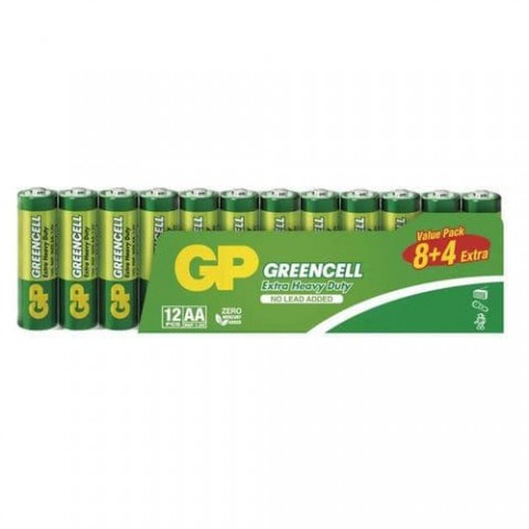 Zinkochloridové baterie, které jsou ekonomickým zdrojem elektrické energie vhodným pro energeticky nenáročná zařízení. Výkonnost těchto baterií nejlépe vynikne při použití v přístrojích s malým až středním odběrem proudu jako např.: dálkové ovladače, hodiny, budíky, kalkulátory, meteostanice, apod. Maximální doba skladování je až 3 roky. Hmotnost: 17,3 g.Zinková baterie GP Greencell AA (R6), 12 ks